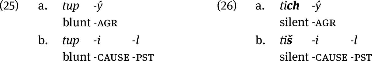 Haspelmath calls this the anticausative pattern. This type of pattern is also found in Czech and it instantiates the fourth class of verbs, which was left undiscussed in Section 6.2. In (43), we give an example of a causative derived from the adjective tup-ý ‘blunt.’ In order to express the inchoative reading (‘get blunt’), Czech must add a reflexive marker se to the causative, see (43b). There is no non-reflexive form that would be able to express this meaning.