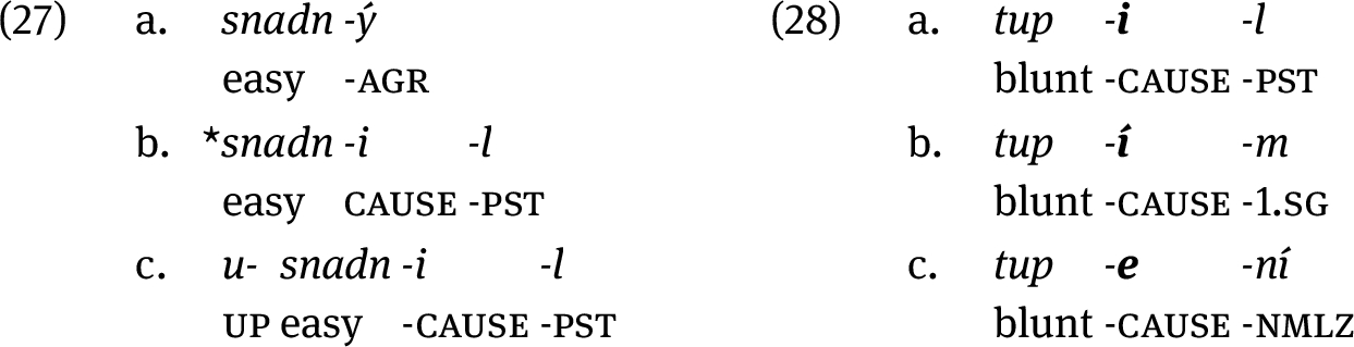 The next point we want to bring out is that all the affixes shown in the table can show the inchoative–causative ambiguity. For reasons of space, we only illustrate this for the suffix -en, (5):