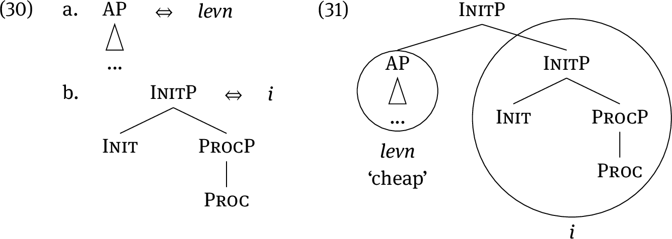 What is the lexical entry for -en? Recall that in Nanosyntax, lexical entries are understood as memorized links between syntactic structures (constituents) and phonology. Therefore, by proposing that the suffix -en spells out the heads proc and init, as shown informally in (21), we are led to assign to it the lexical entry (22), which corresponds to a constituent containing these two features.