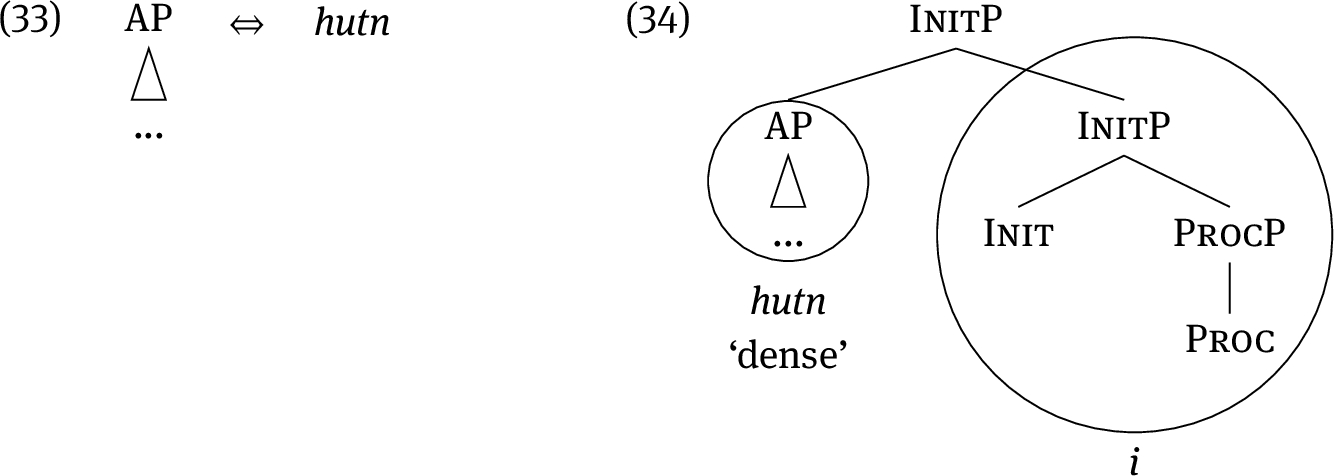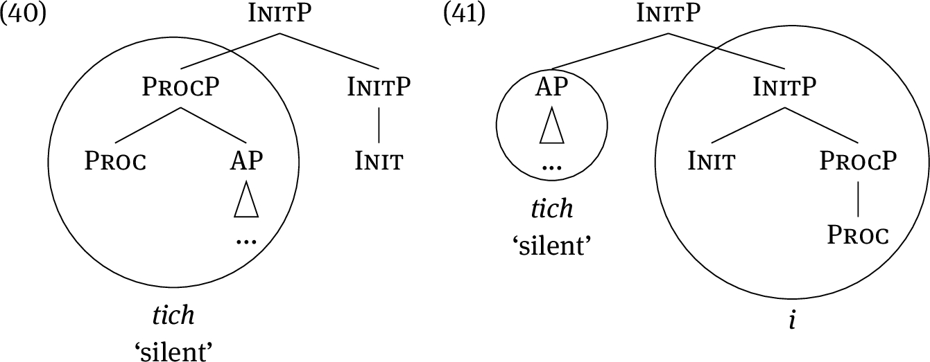 But now a problem arises. Specifically, the lexical tree in (22) does not contain the syntactic tree (21), nor any subpart of it, as a subtree. Therefore, the Superset Principle is not met, and the heads Proc and Init cannot be spelled out by (22) as long as the structure is as given in (21). This problem is resolved by moving the AP node to the specifier of the InitP, yielding (23). This movement is driven by the need to lexicalise the features Init and Proc.
