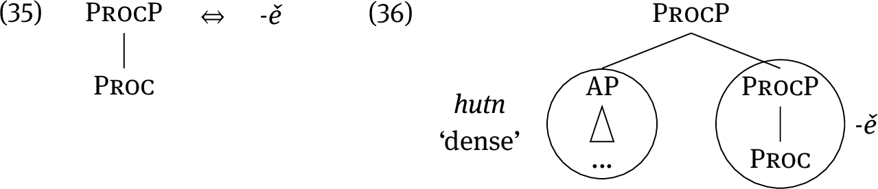 It is relevant to note that if there was a suffix in the English lexicon that would only be specified for the circled ProcP, this suffix would also qualify as a match for (24b), and it would, in fact, take precedence over the ambiguous causative/inchoative -en, on the grounds that it is more specific. There is no such suffix in English, but we will be led to propose such a suffix in Czech in the next section.