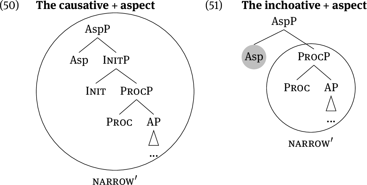 Suppose now that a language has a lexical entry like the one in (49). The lexically stored tree of this hypothetical entry does not only contain the argument structure projections, but also the aspectual projection Asp. This lexical entry can spell out all the projections in (48), see (50). However, the entry (49) cannot be used to spell out all the projections of the inchoative structure, as shown in (51). The reason is that the AspP given in (51) is not contained (as a constituent) inside the lexical entry (49). The lexical entry does contain the procP, so that ProcP can successfully lexicalise, as indicated by the circle in (51). But this leaves the Asp head without lexicalisation, which is marked by the grey circle in (51).