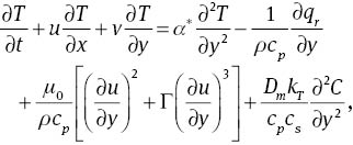 The velocity, temperature, and concentration fields subject to the boundary layer and Rosseland approximations are governed by the following equations: