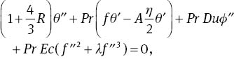 where A is the unsteadiness parameter, λ is the Williamson fluid parameter, Pr is the Prandtl number, Du is the Dufour number, Sr is the Soret number, Sc is the Schmidt number, Ec is the Eckert number, Bi1 is the thermal Biot number, Bi2 is the concentration Biot number, and R is the radiation parameter. The definitions of these parameters are