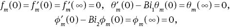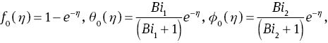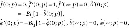 in which Ci (i= 1–7) are the arbitrary constants. If p∈ [0 1] denotes an embedding parameter, and ℏf,ℏθ, and ℏφ are the non-zero auxiliary parameters, then the zeroth-order deformation problems can be put into the forms