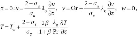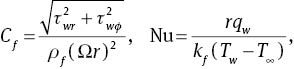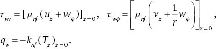 where τwr and τwϕ are the radial and transversal shear stress at the surface of the disk, respectively, and qw is the surface heat flux, which are defined as