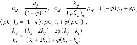 in which, the nanoparticle volume fraction is denoted by φ, μf is the viscosity of the fluid fraction, and ρf and ρs are the densities of the fluid and of the solid fractions, respectively. The heat capacitance of the nanofluid is given by (ρCp)nf, and knf stands for the effective thermal conductivity of the nanofluid approximated by the model given by Oztop and Abu-Nada [40], which is restricted to spherical nanoparticles only. The thermophysical properties of water and different nanoparticles are given in Table 1 [40].