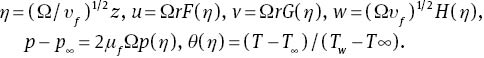 We consider here an incompressible, steady, and axially symmetric nanofluid flow over a porous rotating disk. The disk is placed at z=0 and rotates with an angular velocity Ω through a porous medium, where the Darcy model is assumed [39]. The physical model of the rotating disk is shown in Figure 1 [30]. The governing equations of the nanofluid motion and energy in cylindrical coordinates are