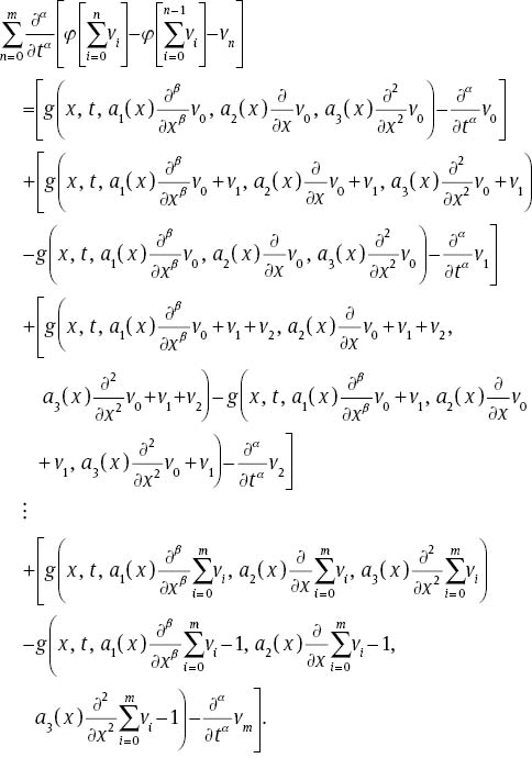 Furthermore, λi=||vi+ 1||/||vi||=0<1 for i ≥ 1. This confirms that the reconstruction of variational approach for FPDE (40) converges to its exact solution.