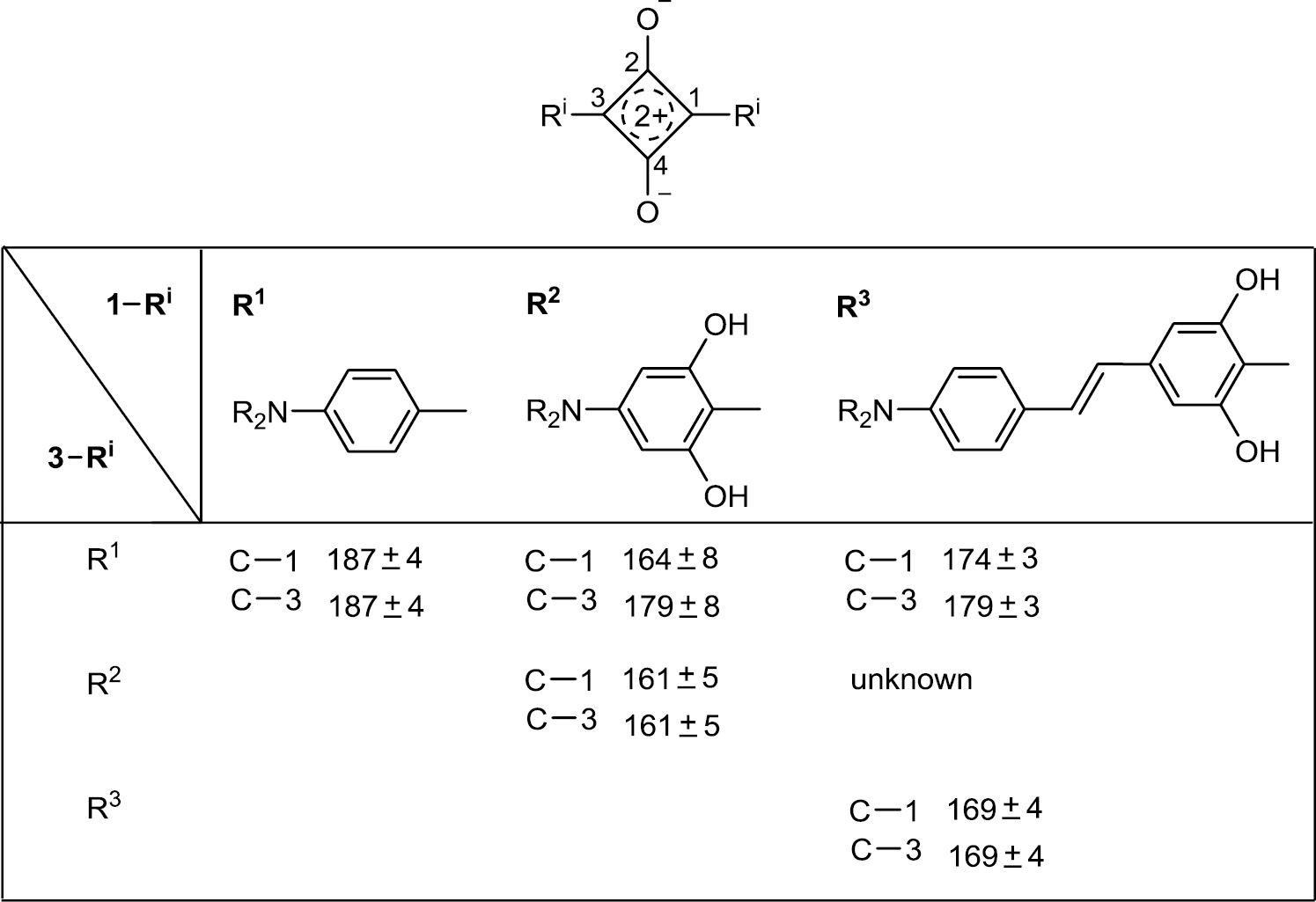 13C Chemical shifts (δ values in ppm) of C-1 and C-3 in the squaraine rings bearing the substituents Ri (i=1–3); measurements in CDCl3).