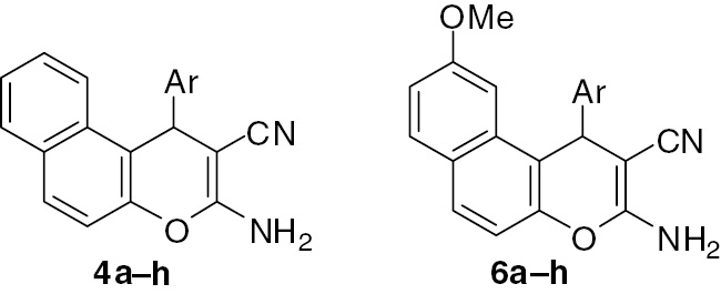 One of the main objectives of organic and medicinal chemistry is the design and synthesis of molecules having as much value as human therapeutic agents. The benzochromene nucleus has been emerged as a promising and attractive scaffold in the development of potent antitumor agents and the treatment of human diseases. For example, Crolibulin™ (A) is currently in Phase I/II clinical trials for the treatment of advanced solid tumors [1], 2-amino-4-(3-nitrophenyl)-4H-benzo[h]chromene-3-carbonitrile (B), which is an inhibitor of diabetes-induced vascular dysfunction [2], 2-amino-5-oxo-4-phenyl-4,5-dihydropyrano[3,2-c]chromene-3-carbonitrile (C) that served as precursor for the blood anticoagulant warfarin [3], 4-substituted-2-(N-succinimido)-4H-benzo[h]chromene-3-carbonitrile (D) have shown anti-rheumatic activity [4] as shown in Figure 1. In the view of the aforementioned premises, and in a continuation of our interest in the synthesis of 2-amino-4H-chromenes and 2-amino-4H-benzochromenes with anticipated anticancer activity [5], [6], [7], [8], [9], [10], [11], [12], we aimed herein to report the microwave irradiation synthesis of two series of 3-amino-1-aryl-1H-benzo[f]chromene-2-carbonitrile (4a–h) and 3-amino-1-aryl-9-methoxy-1H-benzo[f]chromene-2-carb-onitrile (6a–h) derivatives. This article also explores the in vitro antiproliferative activity of the target compounds toward three cancer cell lines in addition to their structure–activity relationships of the substituent at 1- and 9-positions.