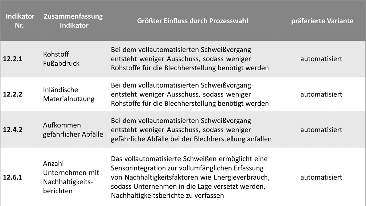 Unter den formulierten Annahmen, ist die Umsetzung in der automatisierten Prozessvariante nach Betrachtung aller Indikatoren als bevorzugt anzusehen. Bedingt ist dies durch den starken Fokus auf den Ressourceneinsatz; abgebildet durch drei von vier betrachteten Indikatoren. Es zeigt sich auch hier die – in der Produktion vorherrschende – Fokussierung auf Ressourceneffizienz. Werden jedoch weitere SDGs wie SDG 8 und SDG 9 zur Bewertung mit einbezogen, erweitern sich die durch den Schweißprozess adressierbaren und zu bewertenden Nachhaltigkeitsaspekte. Beispielsweise wird im Unterziel 8.2 die technologische Modernisierung gefordert, was ebenfalls für eine automatisierte Ausführung sprechen würde. Gegen eine Automatisierung würde beispielsweise Unterziel 9.2 sprechen, das einen hohen Beschäftigungsanteil in der Industrie fordert.