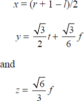 The transformation from a tetrahedral four-component system to an XYZ-orthogonal coordinate axis system has been solved using the geometry of a tetrahedron. If a four component mixing ratio is described as t, l, r, and f (here, t + l + r + f = 1), the transforming equations can be written as