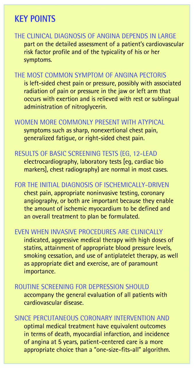 Angina pectoris is defined as cardiac-induced pain arising from a lack of myocardial oxygen. not only do 10.2 million americans have this condition and approximately 500,000 new cases of angina occur each year, but ischemic heart disease is the leading cause of death in the united states.1 moreover, the lifetime risk of developing coronary artery disease (CAD) after 40 years of age is estimated at 49% for men and 32% for women.1 Given the prevalence of this disease, it is important for clinicians to be familiar with the presenting symptoms, as well as current evidence-based treatment options.