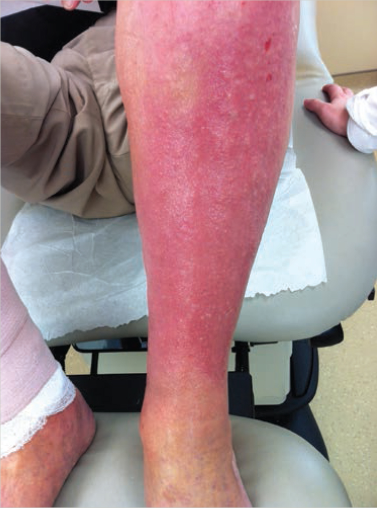 An 81-year-old man presented to the family medicine clinic with a complaint of several months of redness and inflammation on his left lower extremity. The lesion appeared after the patient received a diagnosis of deep vein thrombosis about 5 months before the current presentation. The patient received a diagnosis of cellulitis 3 to 4 weeks later and oral antibiotics were prescribed, but they provided no relief. At the current presentation, the patient’s vital signs were normal. Physical examination revealed large, blanching, erythematous plaques that started distal to the knee and tapered at the ankle. The skin was warm and indurated, but not edematous or tender. The skin was hard and had a scaly appearance. Laboratory test results were normal, except for a minimally elevated erythrocyte sedimentation rate. Dermatitis was diagnosed, and the patient was treated with daily Eucerin (Beiersdorf Inc), leg elevation, and compression stockings.