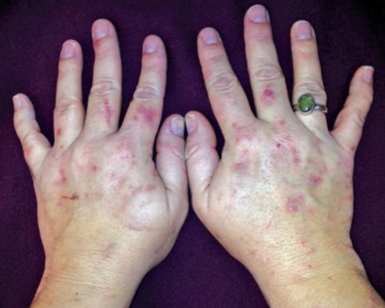 A 39-year-old woman presented to the clinic with recurring blistering lesions on the dorsum of both hands. Over the course of 6 months, the patient’s skin became fragile and bumps that arose during everyday activities resolved to form pigmented scars (image). She took no regular medications and consumed alcohol socially. Results of a complete blood cell count and comprehensive metabolic panel were normal, except for mild elevation of alanine aminotransferase and aspartate aminotransferase. Additional laboratory test results revealed elevated urine uroporphyrin and heptacarboxyl porphyrin levels, which led to the diagnosis of porphyria cutanea tarda. The patient was prescribed low-dose hydroxychloroquine and the lesions resolved. She continues to have regular follow-up appointments.