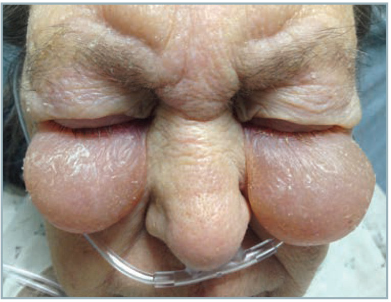 A 71-year-old woman with a history of hypothyroidism presented to the emergency department with dyspnea. Physical examination revealed massive lower eyelid edema bilaterally (image) and dry, flaky skin on her lower extremities. Vital signs were normal. Further investigation revealed that the patient had been noncompliant with her prescribed levothyroxine for more than a year. The results of biochemical tests revealed a thyroid-stimulating hormone level of 220 mIU/L and a free thyroxine level of 0.15 µg/dL. The patient was admitted to the hospital, where a 0.1-mg intravenous dose of levothyroxine was administered daily for 3 days.