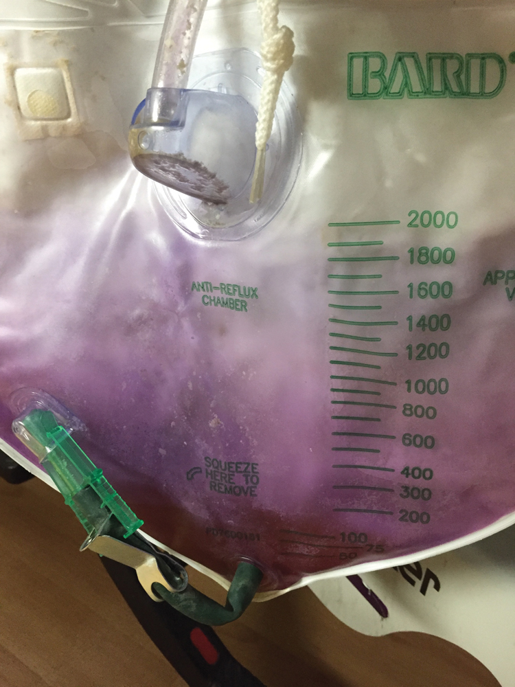 A patient presented to the emergency department with 2 weeks of dark urine, nausea, vomiting, and pain around her urostomy site. She was admitted for suspected bacterial sepsis, and subsequent urine cultures grew Providencia rettgeri, a species commonly associated with purple urine bag syndrome, which this patient had (image).1 The patient was discharged 3 days later after antibiotic administration and resolution of symptoms.