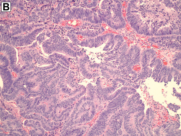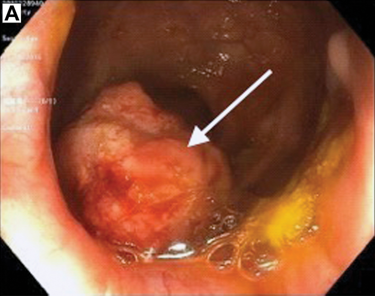 A 76-year-old woman presented to the emergency department with a fever (38.9°C), vomiting, and diarrhea of 2 days’ duration. The patient's medical history included coronary artery disease, stroke, hypertrophic cardiomyopathy, diastolic heart failure, hypertension, and end-stage renal disease, for which she received dialysis. She had no personal or family history of colon cancer. Blood cultures demonstrated growth of Streptococcus gallolyticus (formerly known as Streptococcus bovis) group bacteremia. A transesophageal echocardiogram did not show valvular vegetation. Colonoscopy results revealed a nonobstructing, fungating mass in the distal rectum (image A). Histologic evaluation confirmed low-grade rectal adenocarcinoma with submucosal invasion (image B). The patient was treated with 2 g of intravenous ceftriaxone daily, as the minimal inhibitory concentration to penicillin was 0.10 μg/mL. This regimen was changed to 2 g of cefazolin 3 times per week after dialysis when she was discharged to an acute rehabilitation center for a total of 4 weeks of therapy. She underwent transanal excision of her colonic mass and did not require further radiation or chemotherapy.